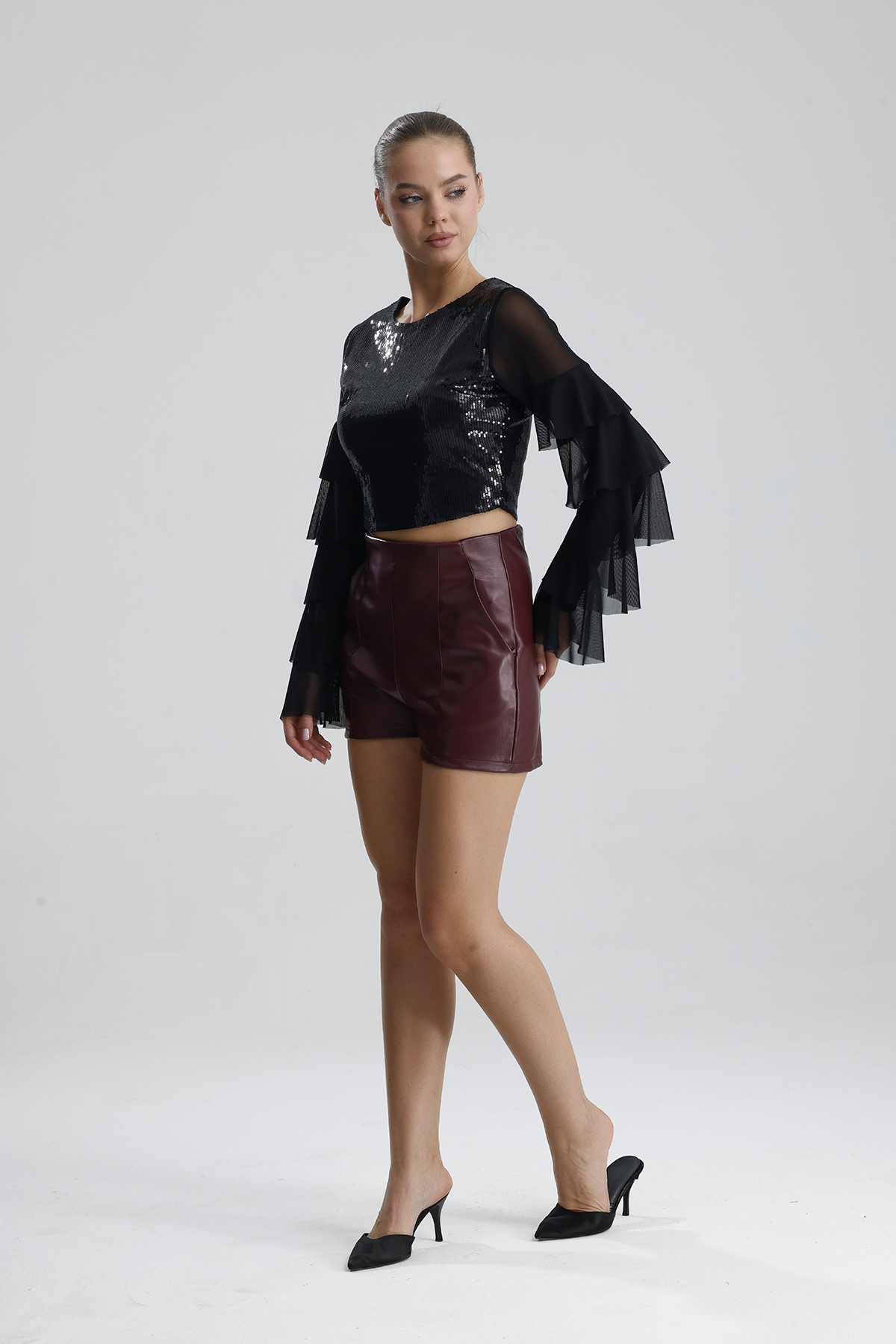 Sense Bordo Suni Deri Yüksek Bel Şort | ŞRT34533