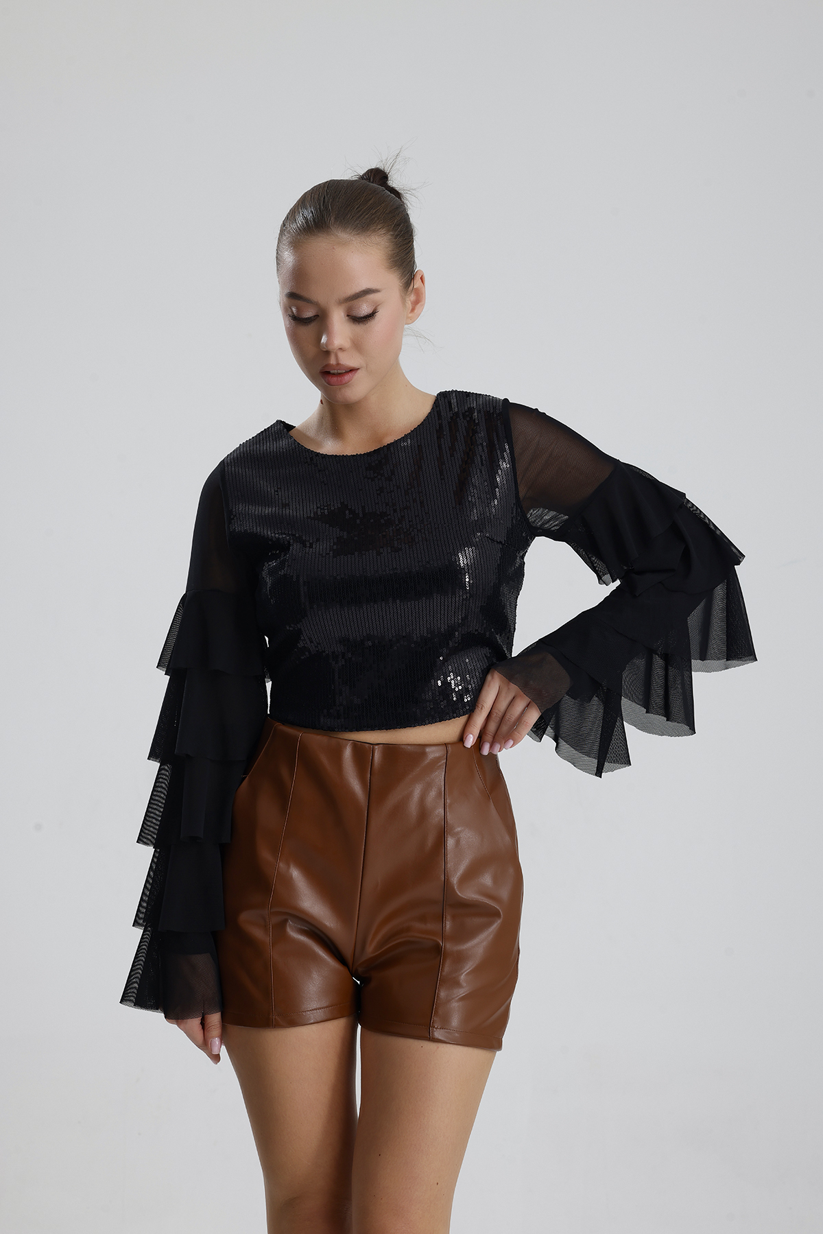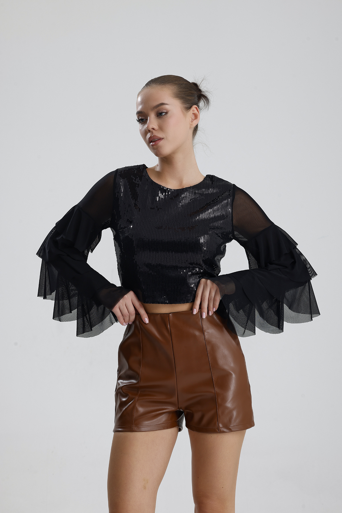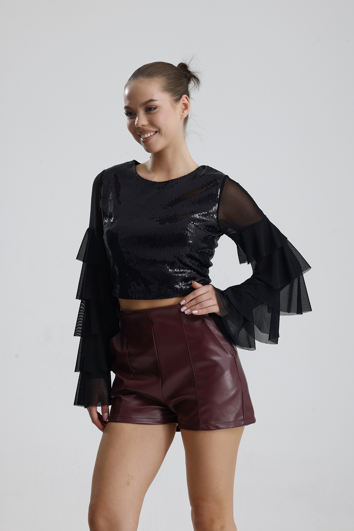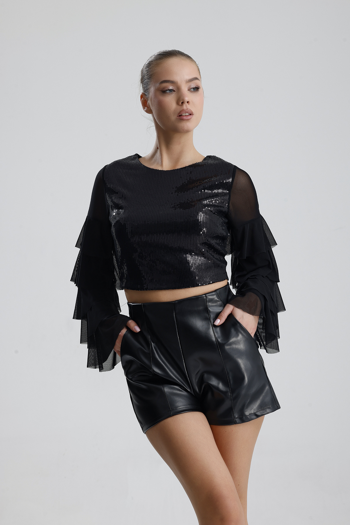Sense Siyah Crop Püskül Detaylı Uzun Kol Suni Deri Bluz | Blz35780
