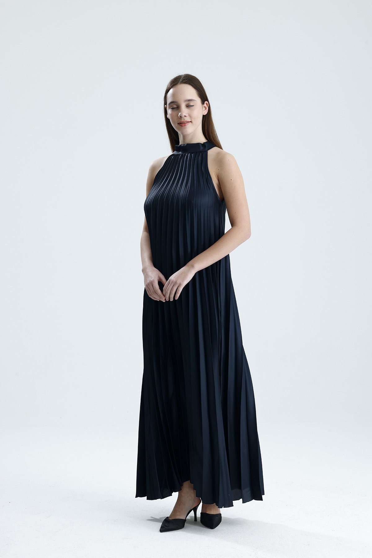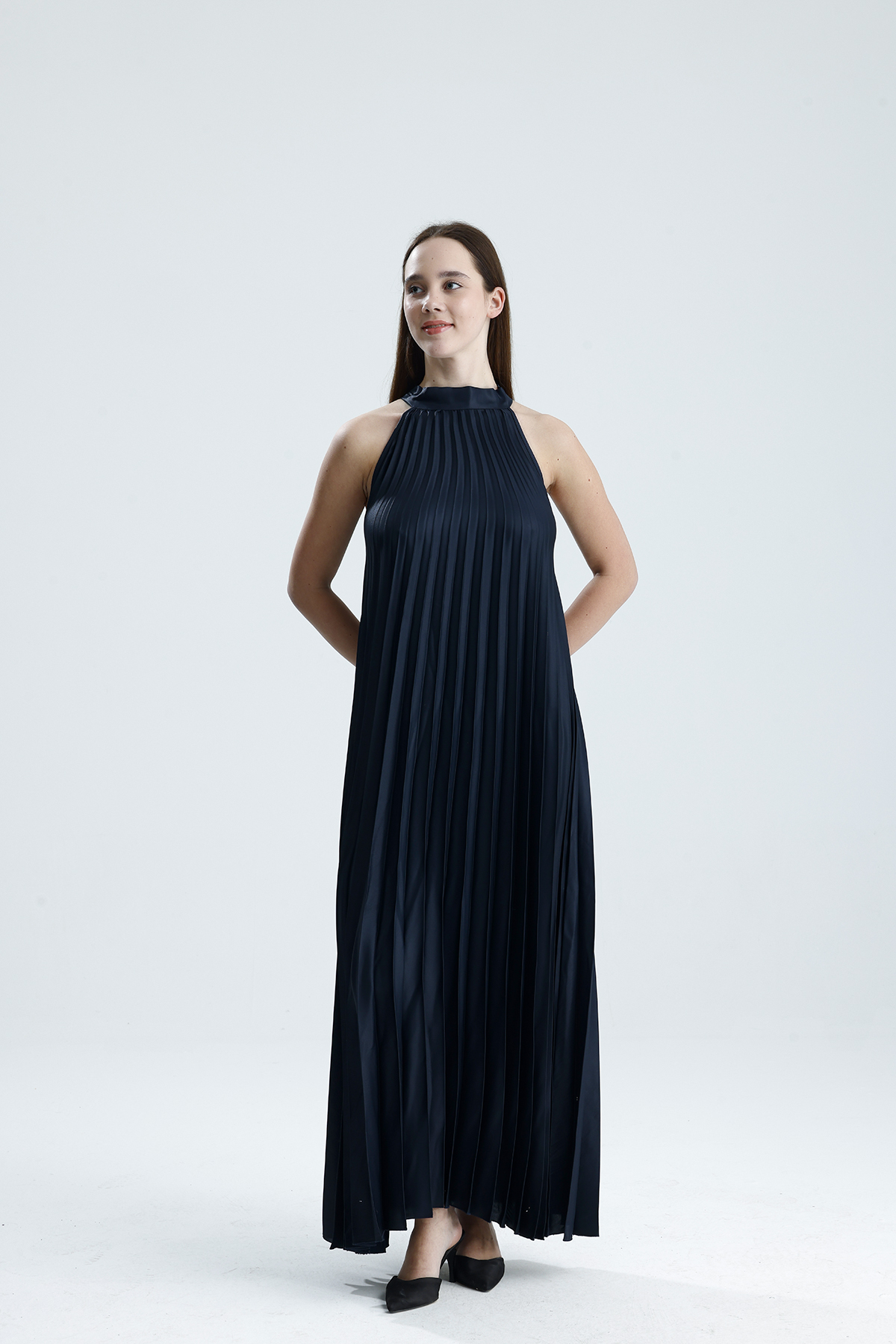 Sense Saks Boyundan Bağlamali Piliseli Kolsuz Saten Elbise | Elb34513