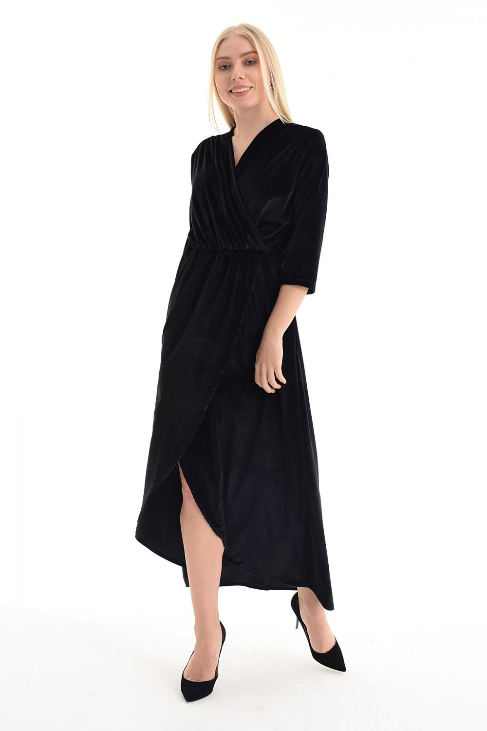 Sense Siyah Kruvaze Yaka Eteği Parçalı Kadife Abiye Elbise | Elb31776