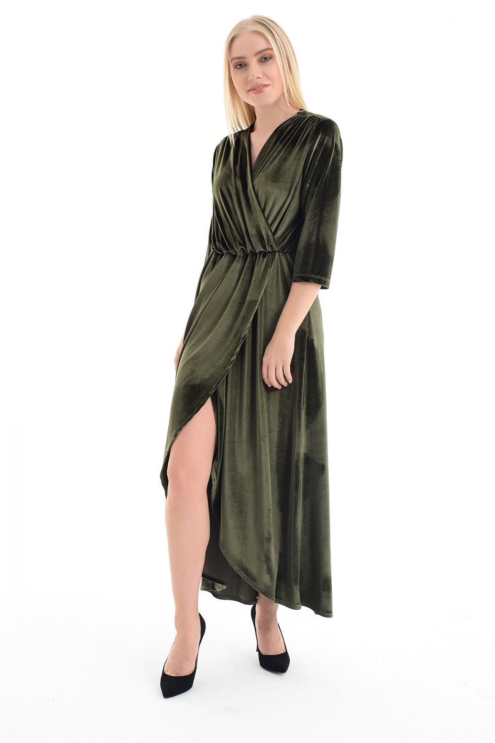 Sense Yesıl Kruvaze Yaka Eteği Parçalı Kadife Abiye Elbise | Elb31776