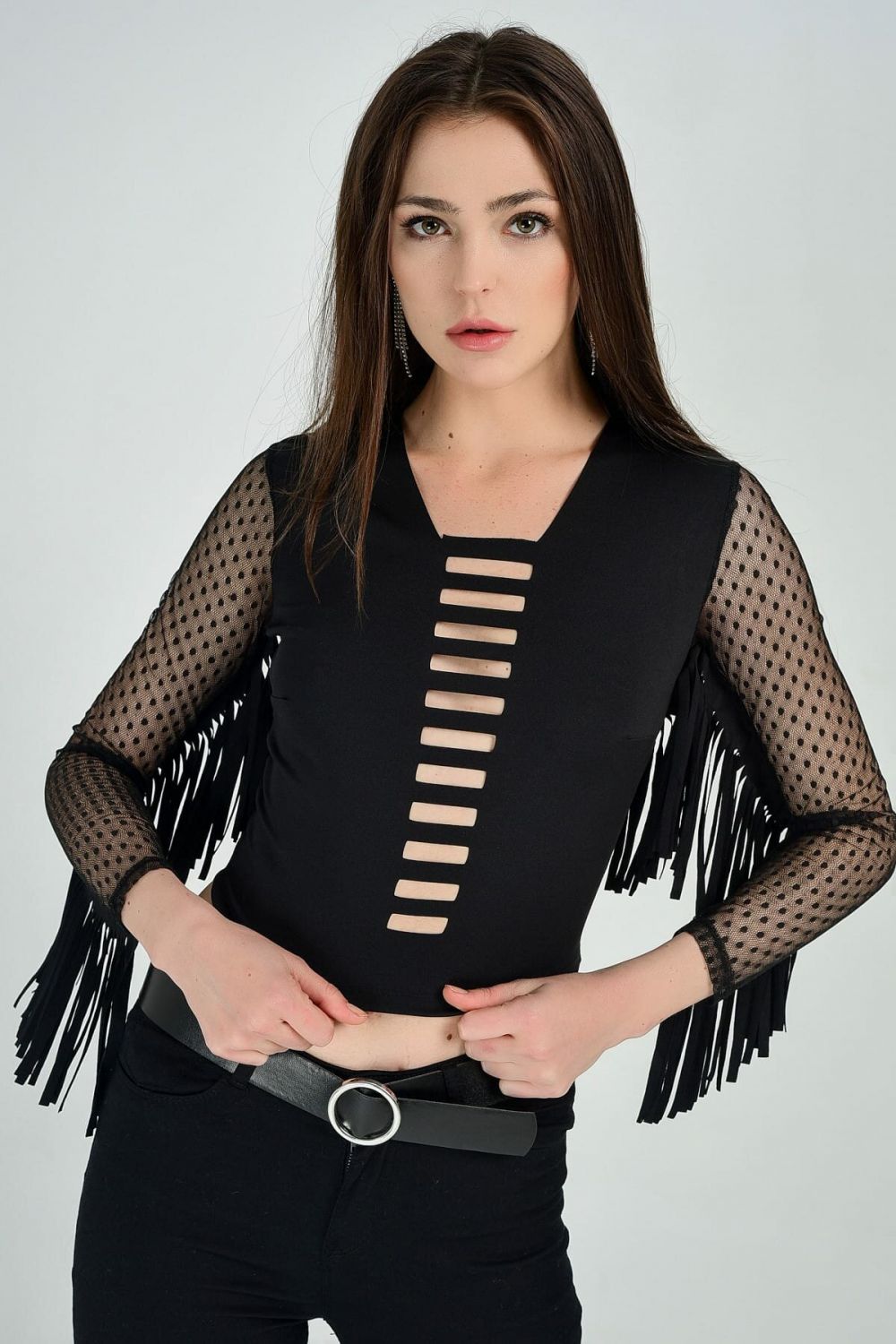 Siyah Lazer Kesim Kol Ve Arka Püskül Kollar Tül Bustiyer|Bst31306