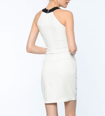 Siyah Beyaz Desenli Kare Yaka Deri Garnili Kolsuz Elbise | Elb13183