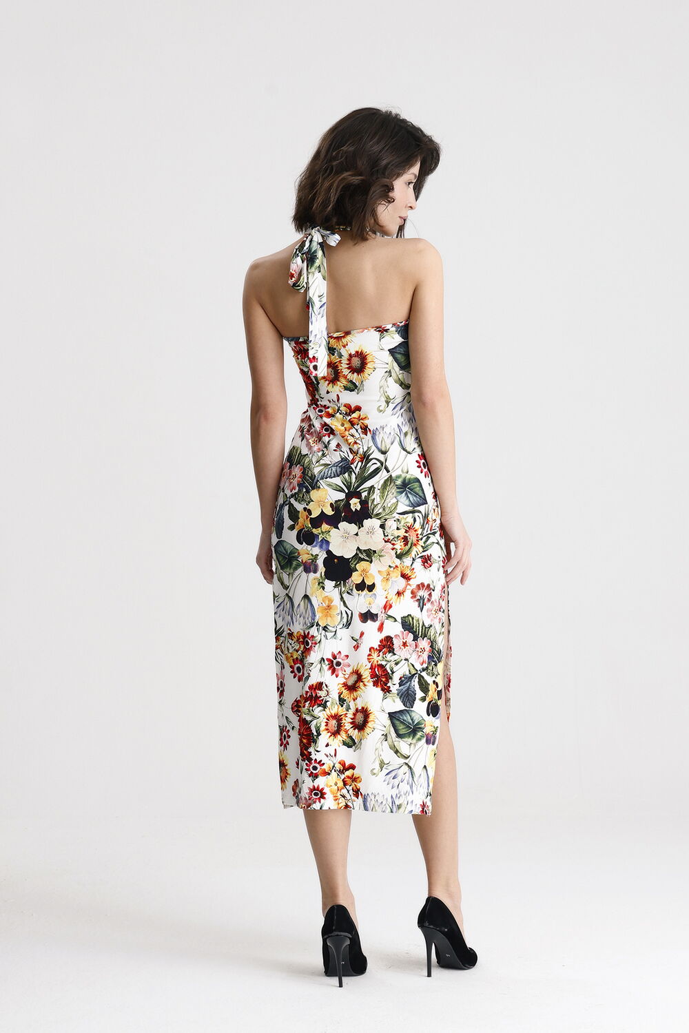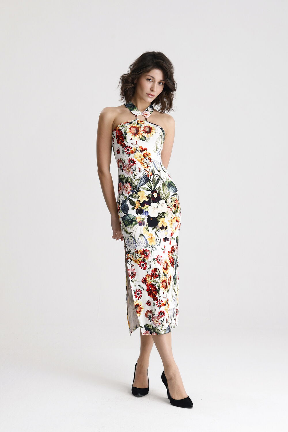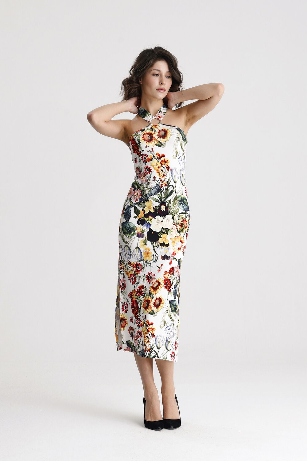 Sense Ayçiçek Desen Viskon Elastan Halka Detaylı Halter Yaka Elbise | ELB36706