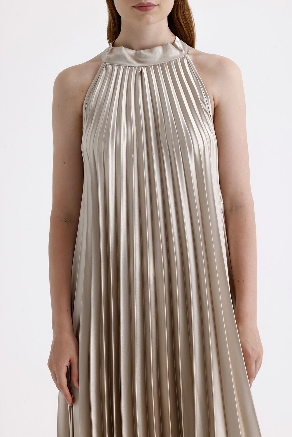 Sense Bej Boyundan Bağlamali Piliseli Kolsuz Saten Elbise | Elb34513