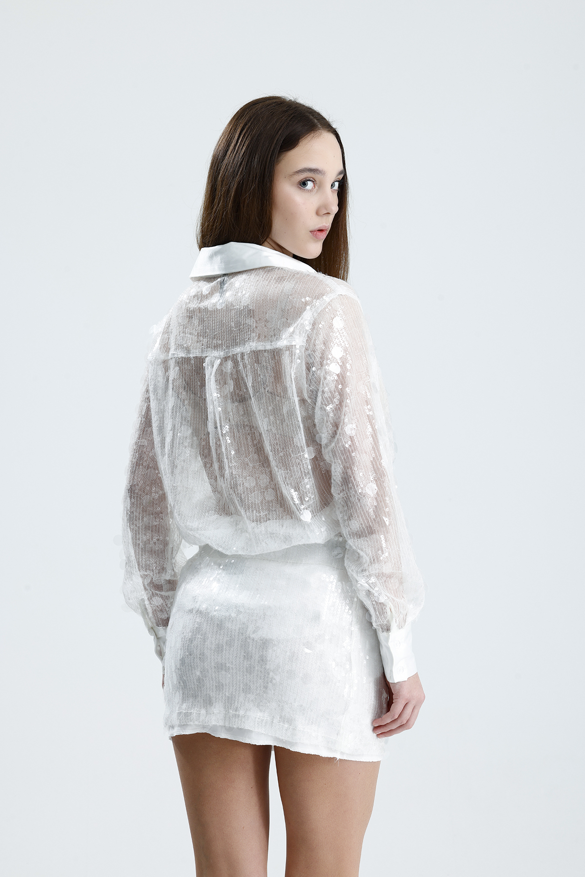 Sense Beyaz Saten Garnili Pul Detaylı Payet Abiye Gömlek | GML36395