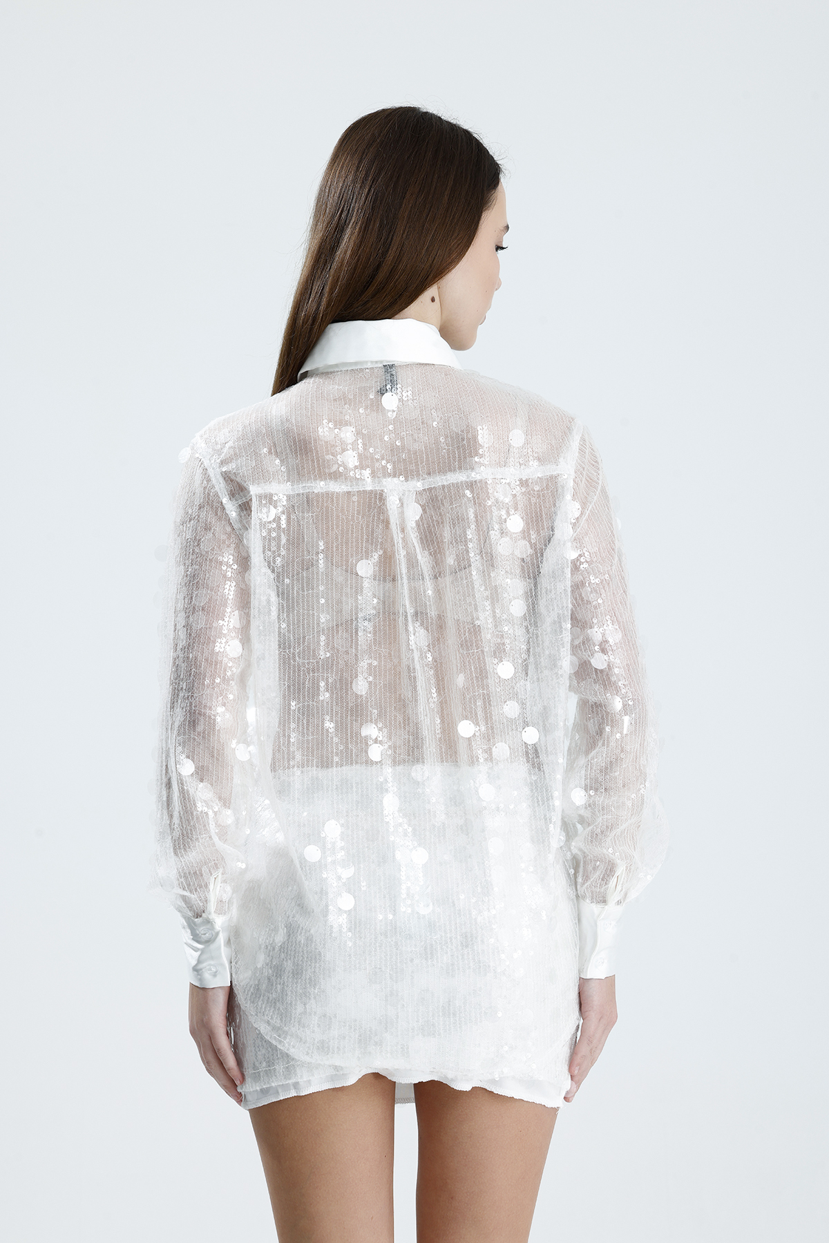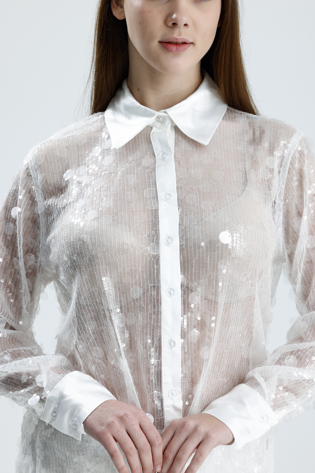 Sense Beyaz Saten Garnili Pul Detaylı Payet Abiye Gömlek | GML36395