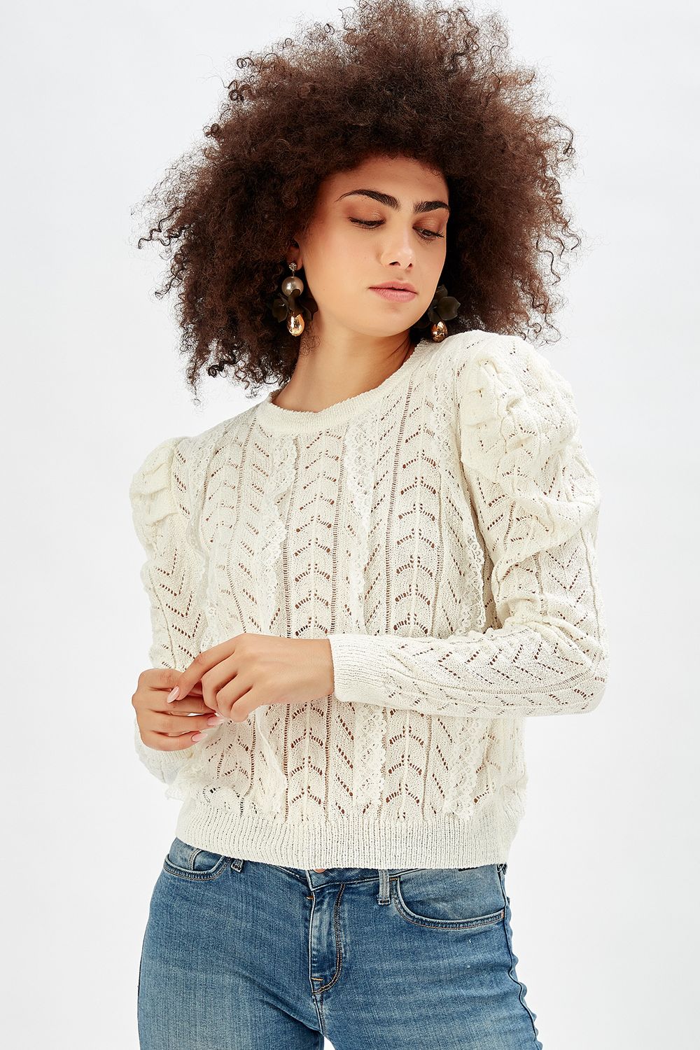 Sense Ekru Kol Omuzlari Büzgülü Ön Dantel Triko Kazak