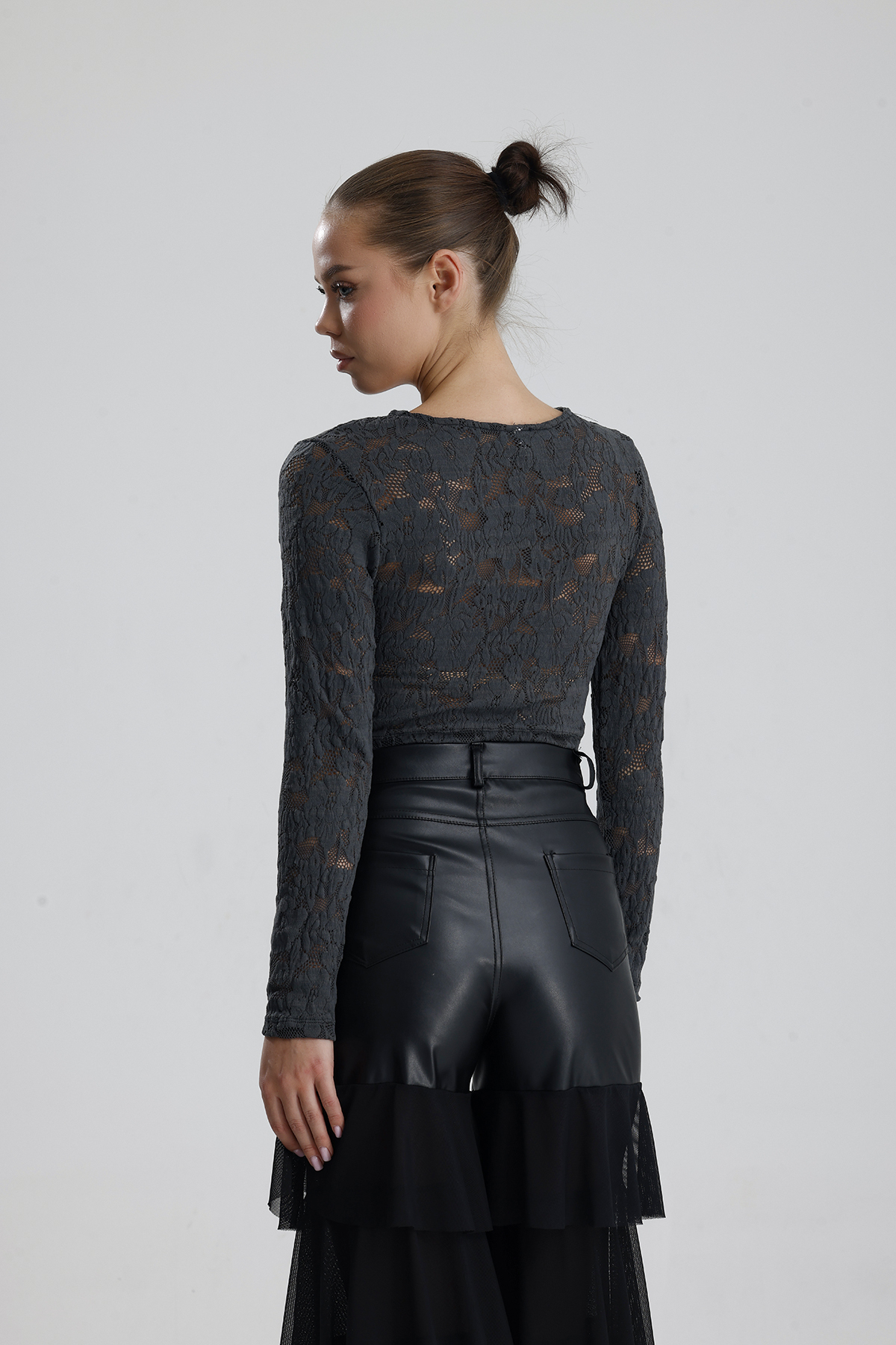Sense Grı Dantel Uzun Kollu Crop Bluz | BUST36259