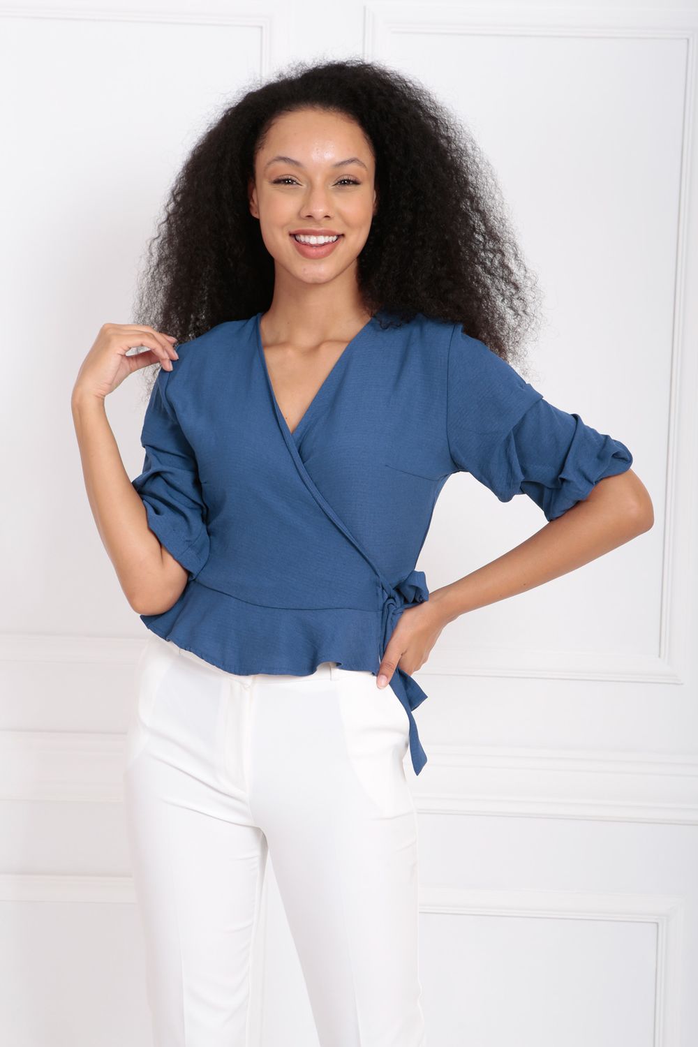 Sense İndigo Ön Kruvaze Kuşaklı Kolağzı Lastikli Bluz | BLZ32738