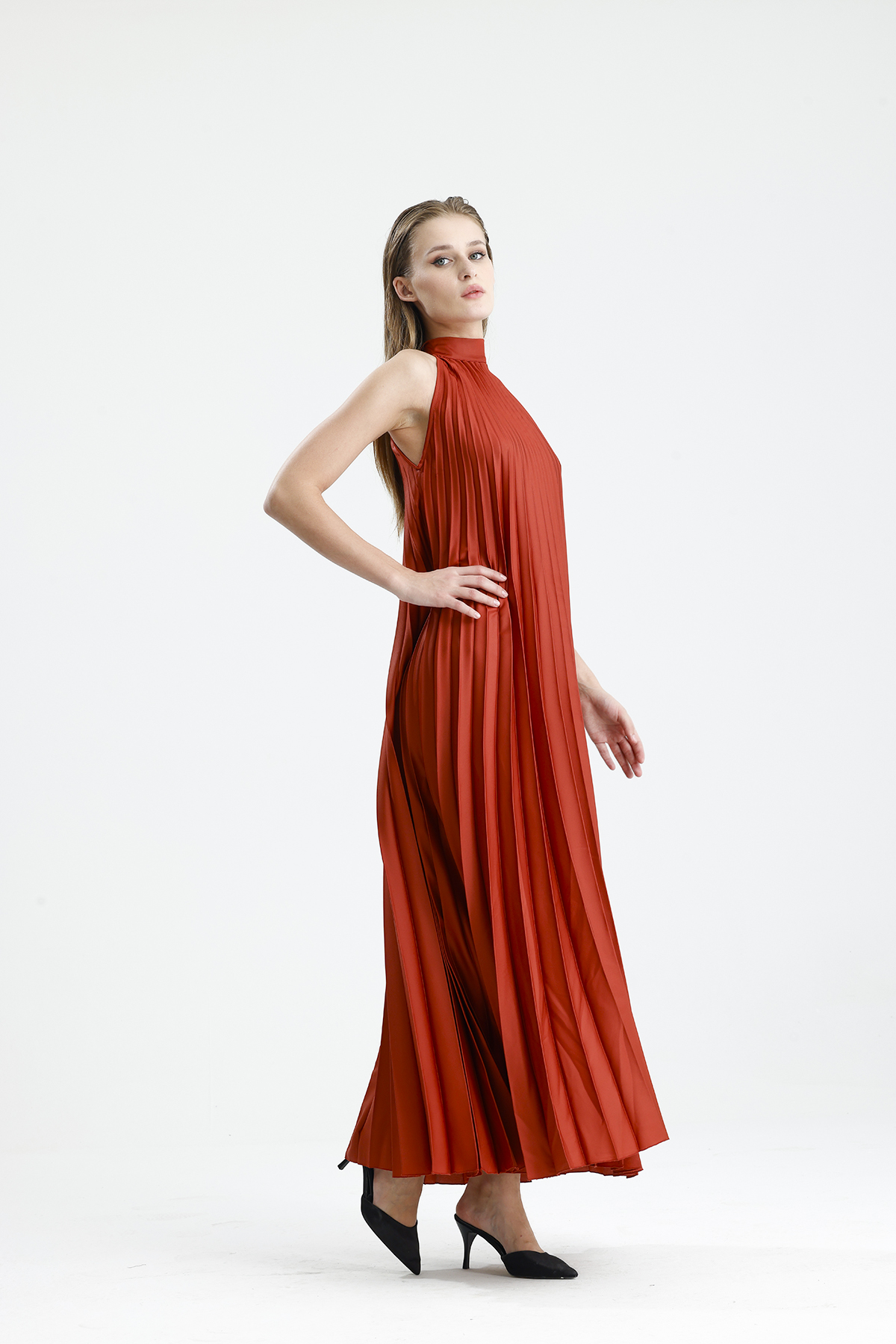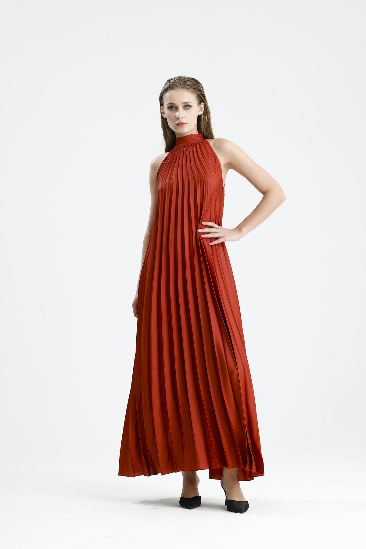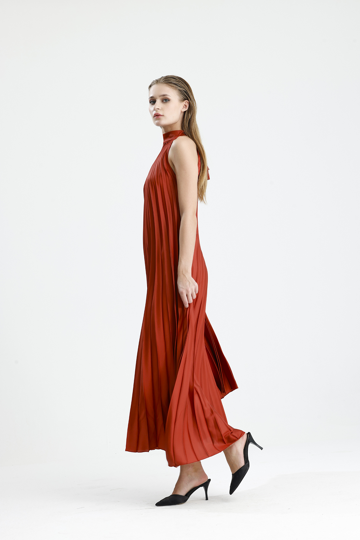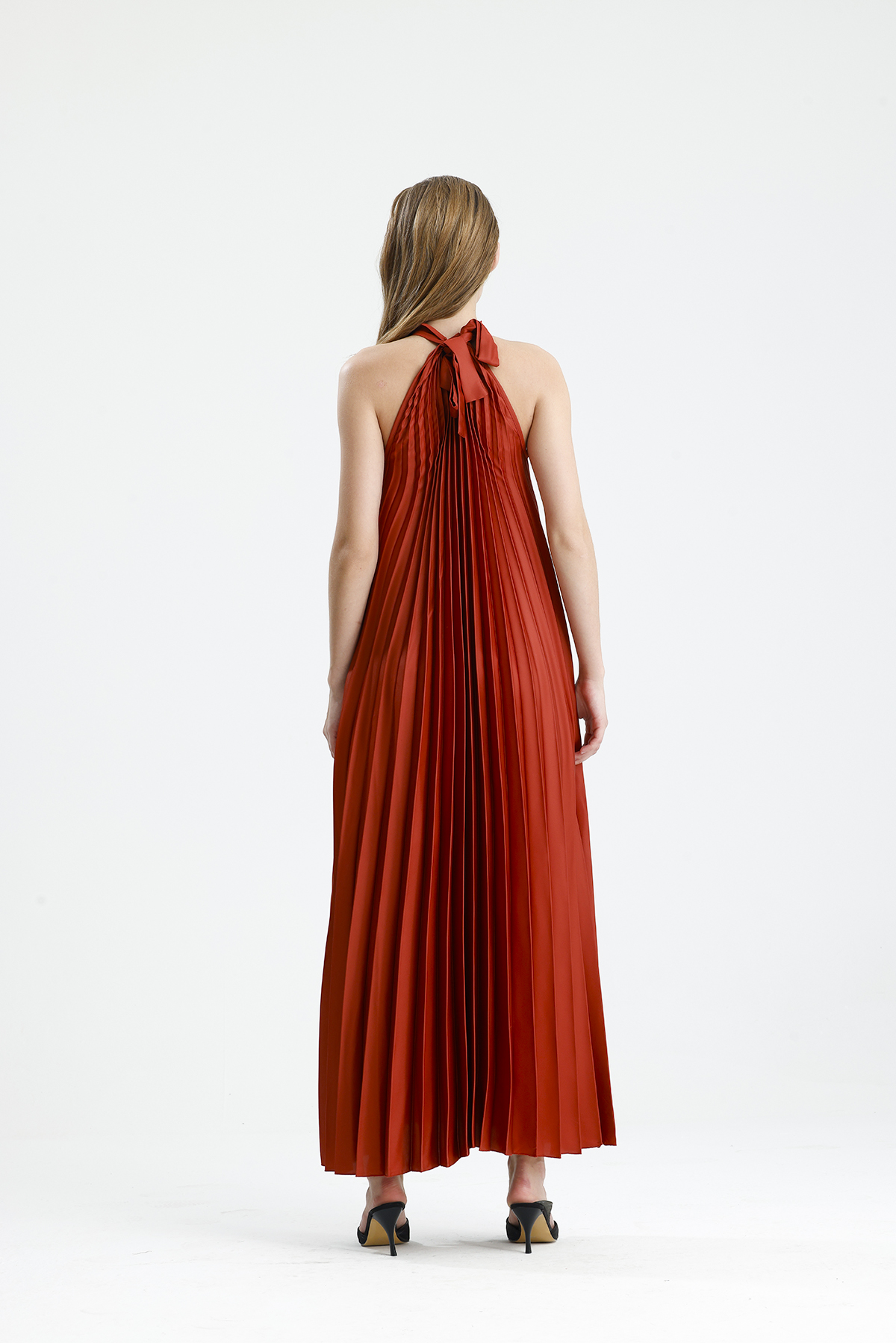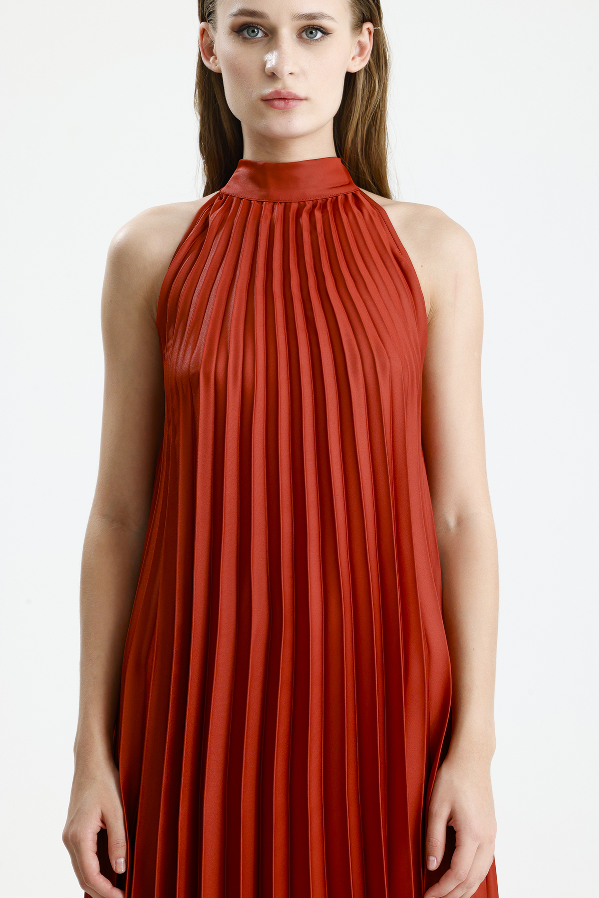 Sense KİREMİT Boyundan Bağlamali Piliseli Kolsuz Saten Elbise | Elb34513