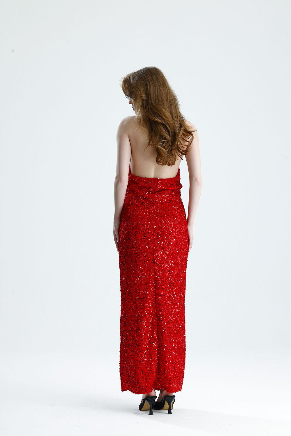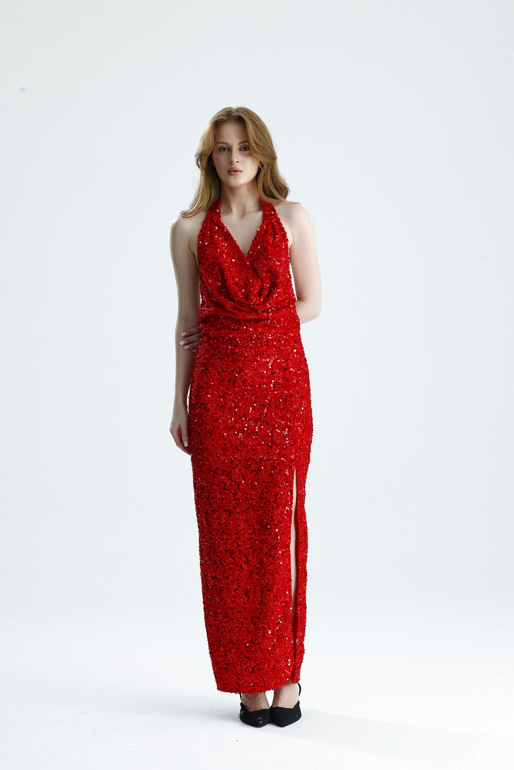 Sense Kırmızı Astarlı Sırtı Açık Degaje Yaka Kadife Payet Abiye Elbise | ELB36670