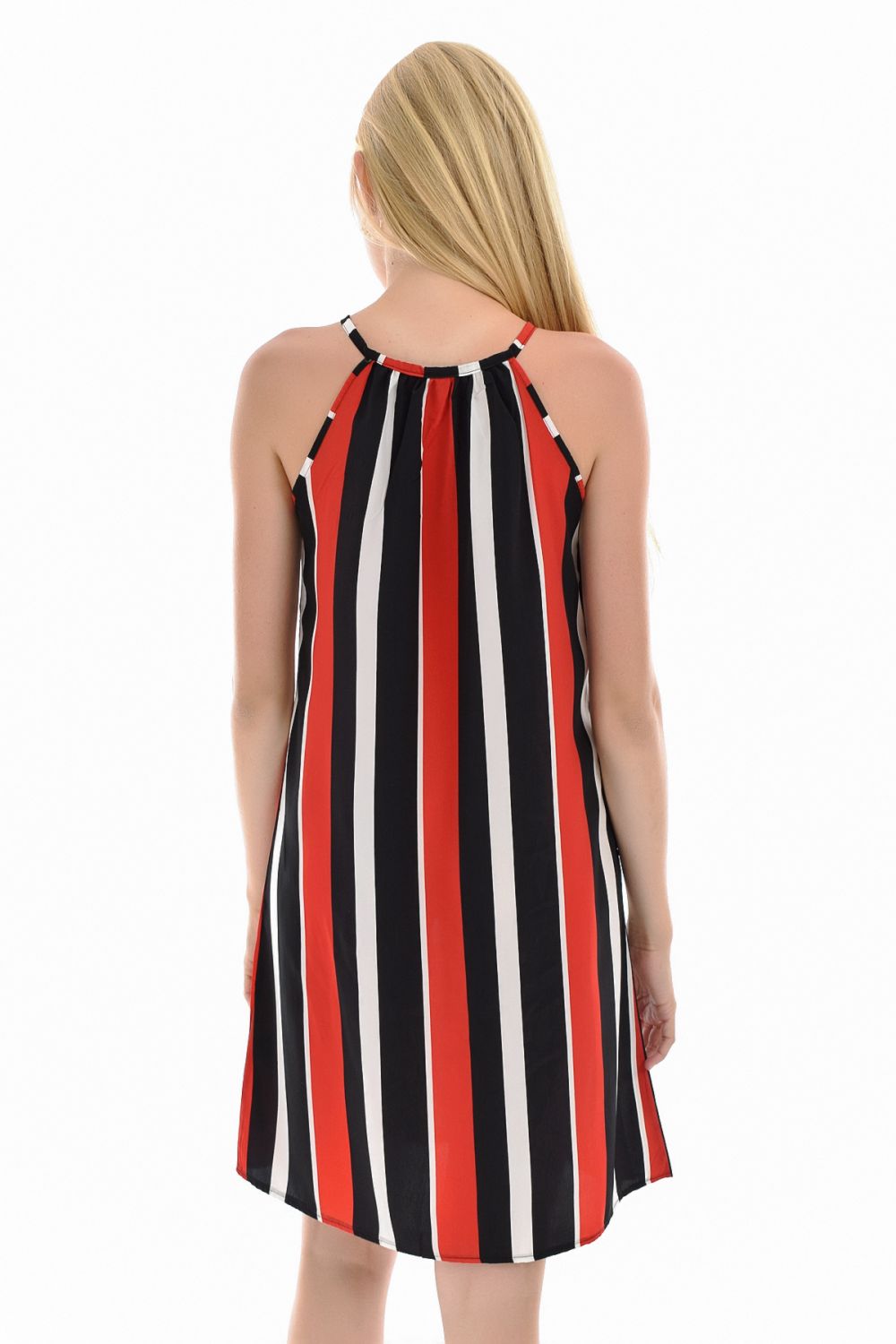 Sense Kırmızı Siyah Çizgili Yaka Biye Ön Deri Aksesuar Örgü Yıkama Kot Elbise | Elb31581