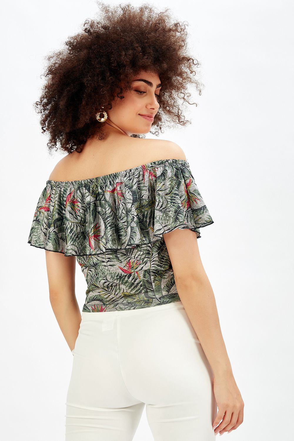 Sense Kuş Desenli Çiçek Ve Papağan Desenli Kısa Volanlı Bluz