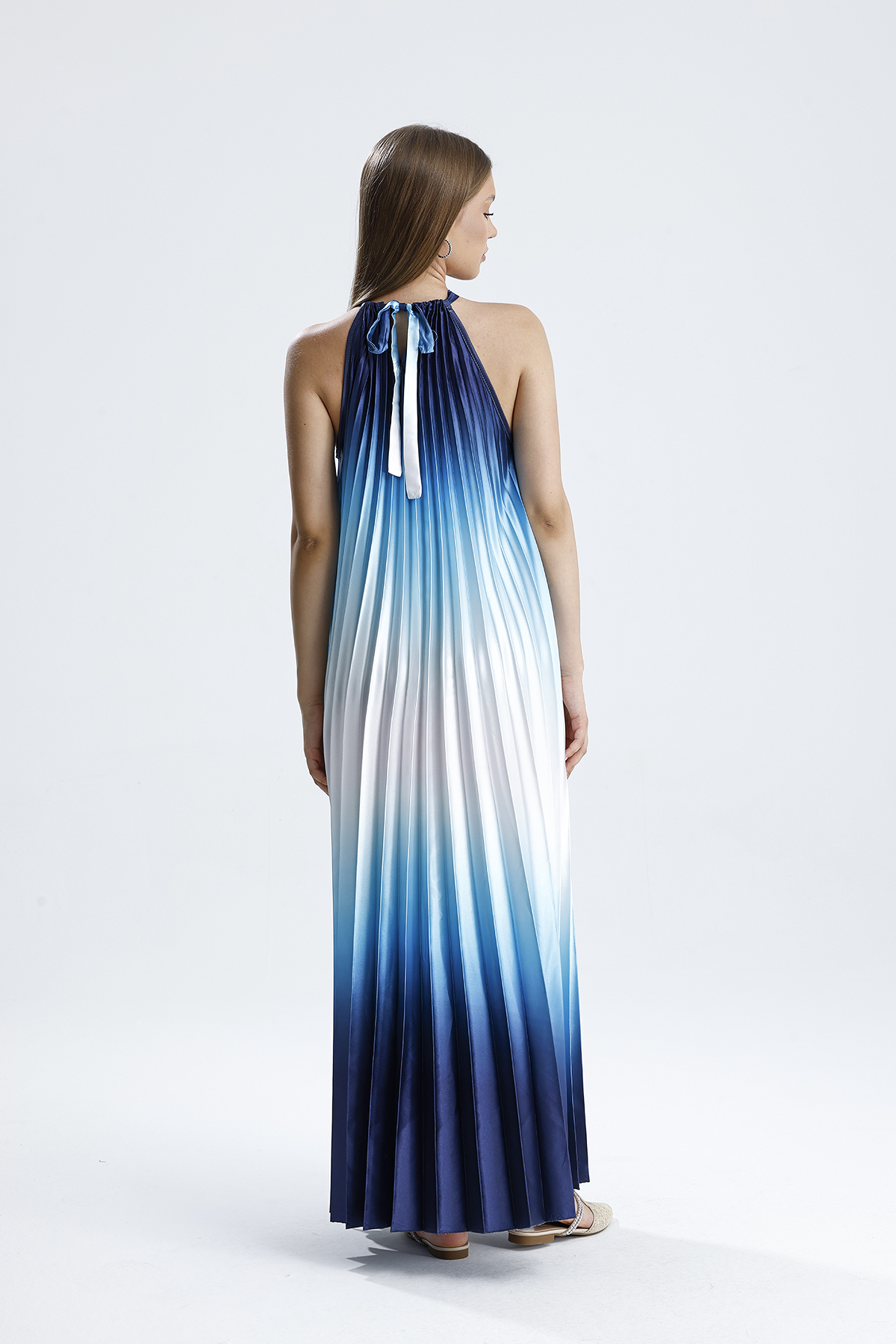 Ürün Detay : Mavi Beyaz Ombre Piliseli Maxi Elbise - Halter Yaka, Şık ve Zarif | ELB35857
