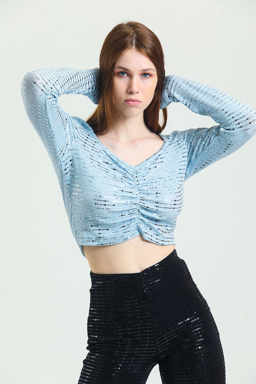 Sense Mavı Uzun Kol Önü Lastik Büzgülü Buzi Payet Bluz Blz34189