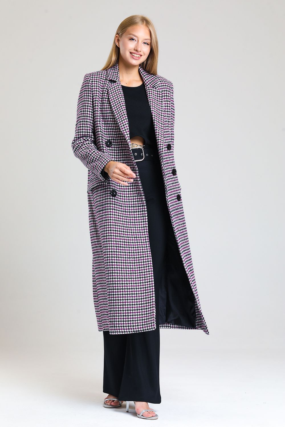 Mor Kazayağı Astarlı Desenli Uzun Kaban | Kbn34176 | Sense