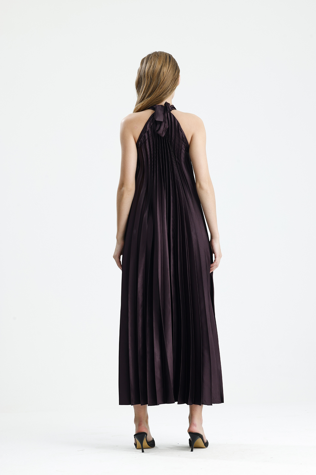 Ürün Detay : Boyundan Bağlamali Piliseli Kolsuz Saten Elbise | Elb34513