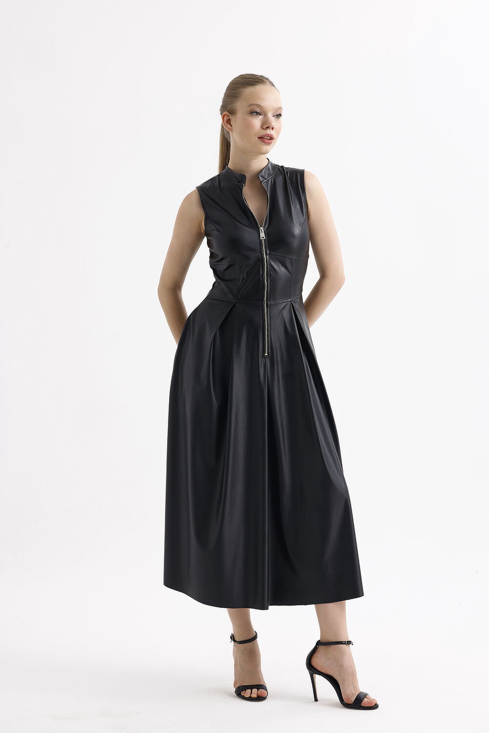 Ürün Detay : Fermuarlı Pileli Suni Deri Elbise | ELB35938