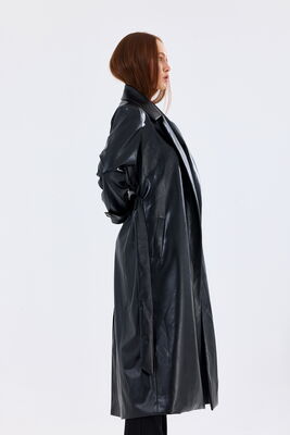 Sense Siyah Astarlı Beli Kuşaklı Apoletli Suni Deri Trençkot Pardüsü