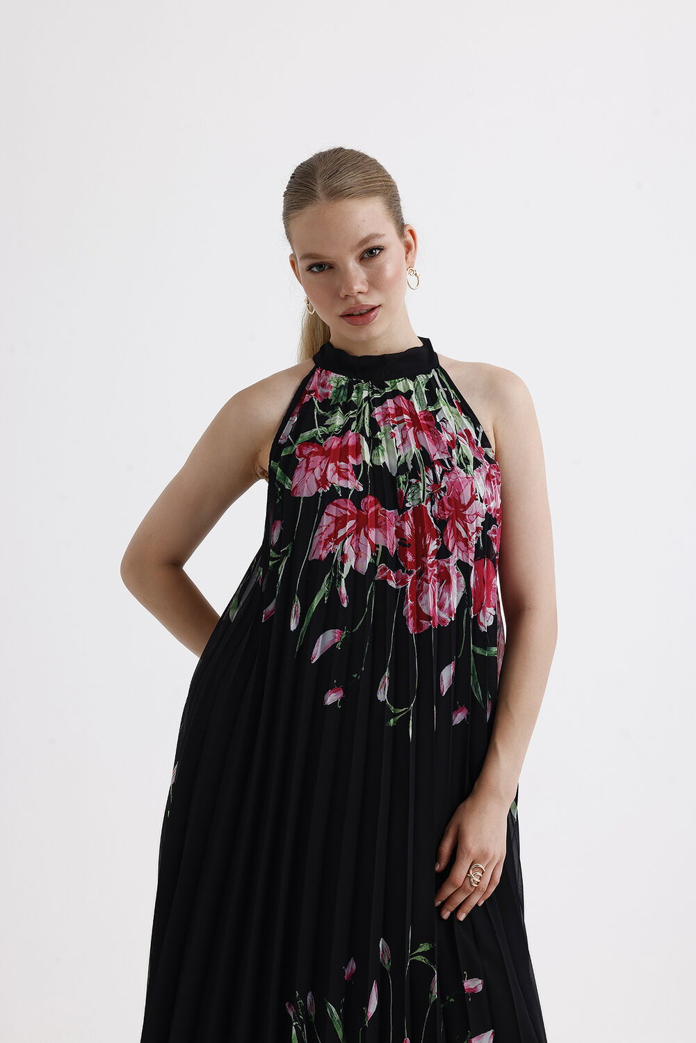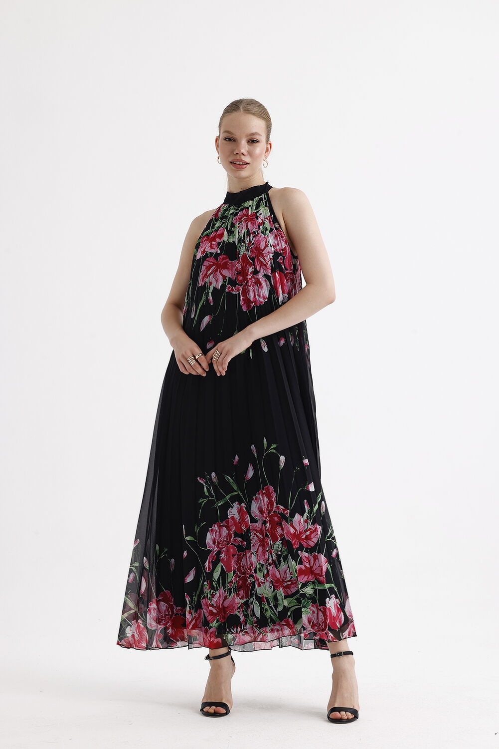 Sense Siyah Çiçekli Astarlı Piliseli Uzun Abiye Desenli Şifon Elbise | ELB35127SF