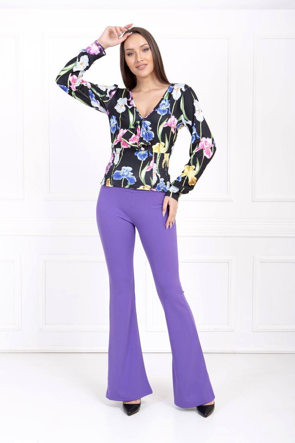Siyah Çiçekli Kroşetalı Fiyonklu U.Kol Baskılı Mikro Bluz | Blz33361 | SENSE