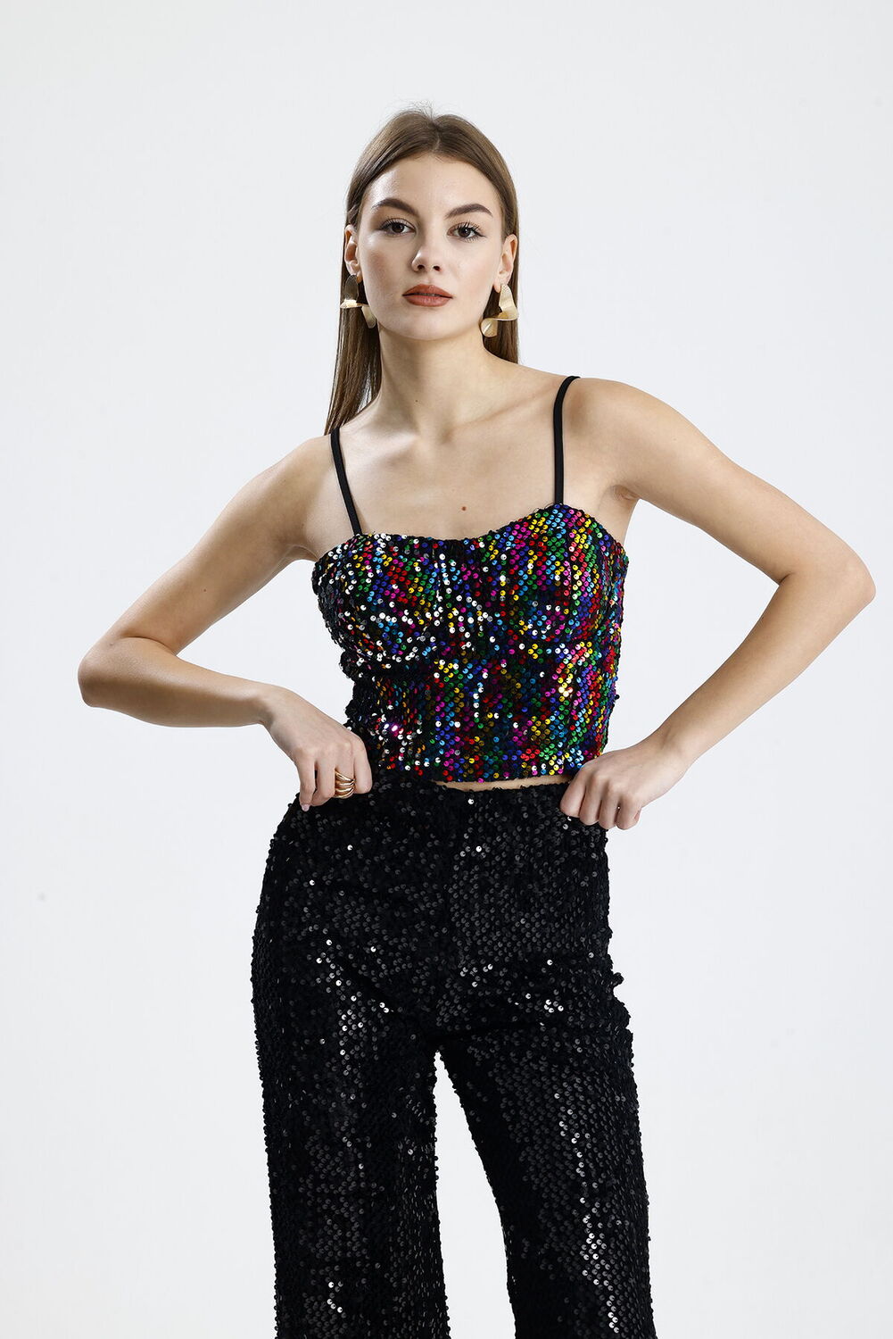 Sense Siyah Gökkuşağı Fermuarlı Payetli Kadife Bustiyer | Bus34034 - Moda ve Giyim Markası | Sense