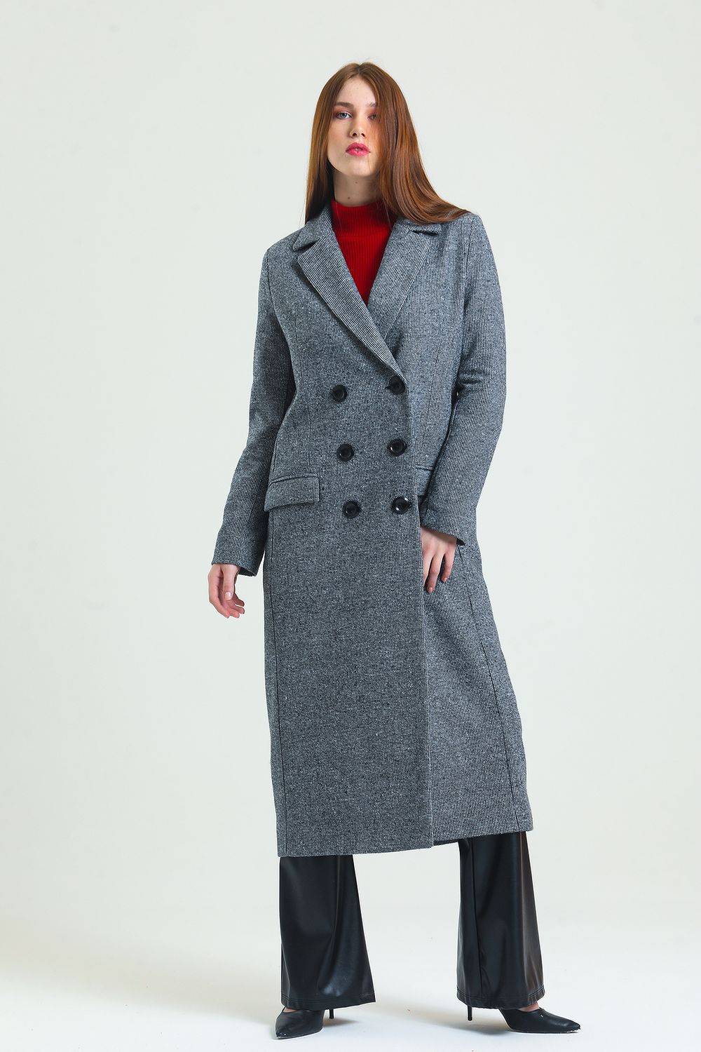 Sense Siyah Gri K.Kazayağı Astarlı Desenli Uzun Kaban | KBN34176