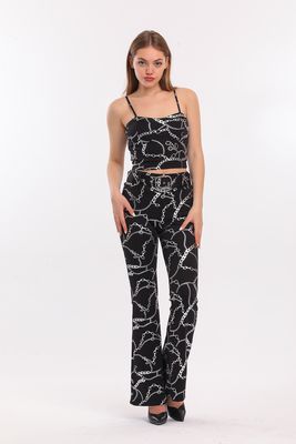 Sense Siyah Gümüş Zincir Des. İspanyolpaça Varak Baskılı Scuba Pantolon | PNT33581