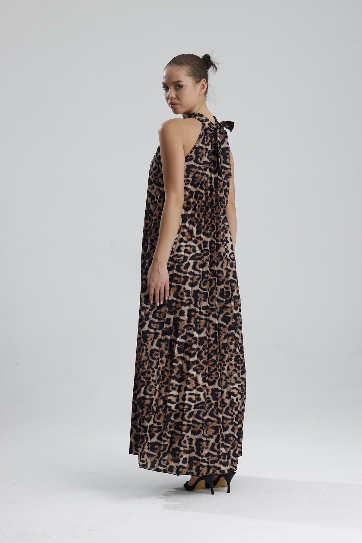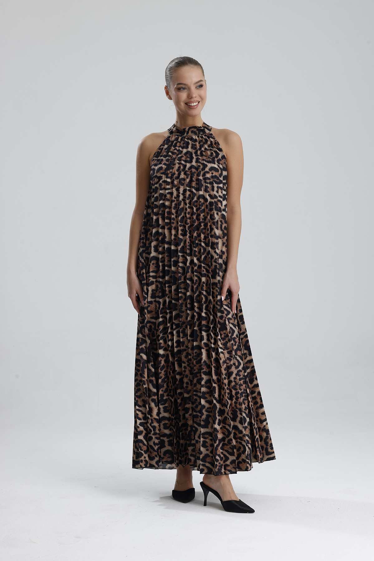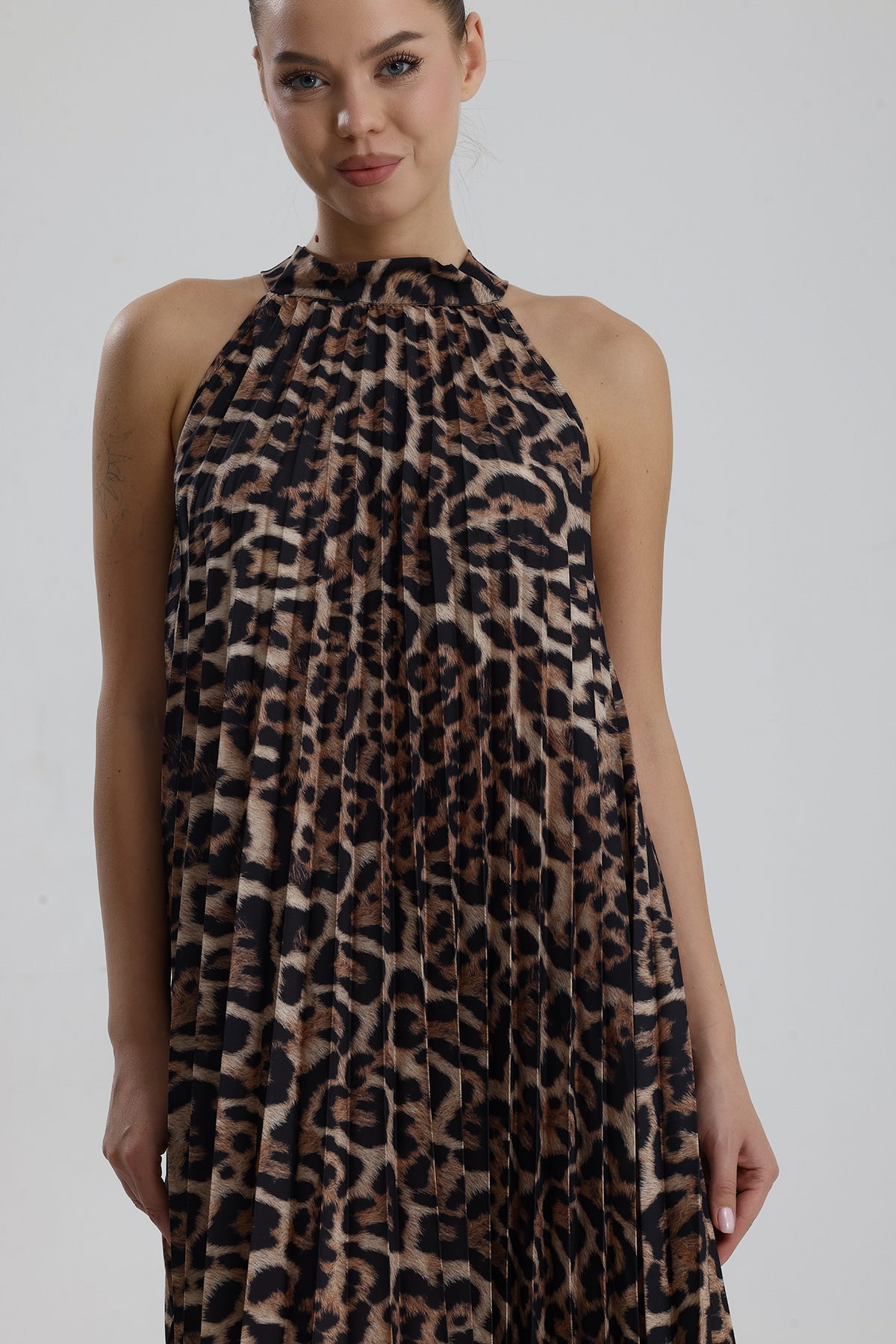 Sense Siyah Kahve Leopar Boyundan Bağlamali Piliseli Kolsuz Saten Elbise | Elb34513