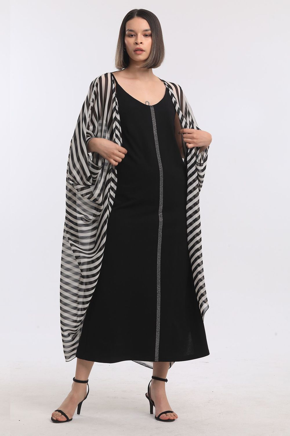 Siyah Kalın Çizgili Şifon Plaj Kimono | ELB33597 | SENSE