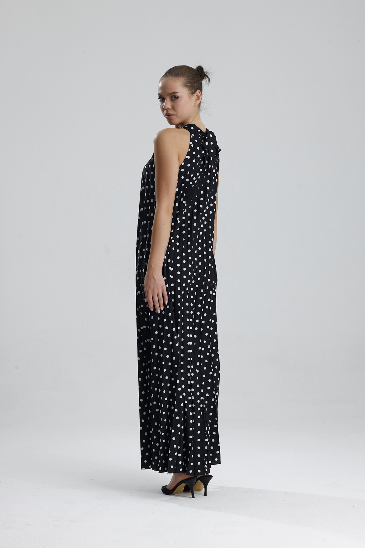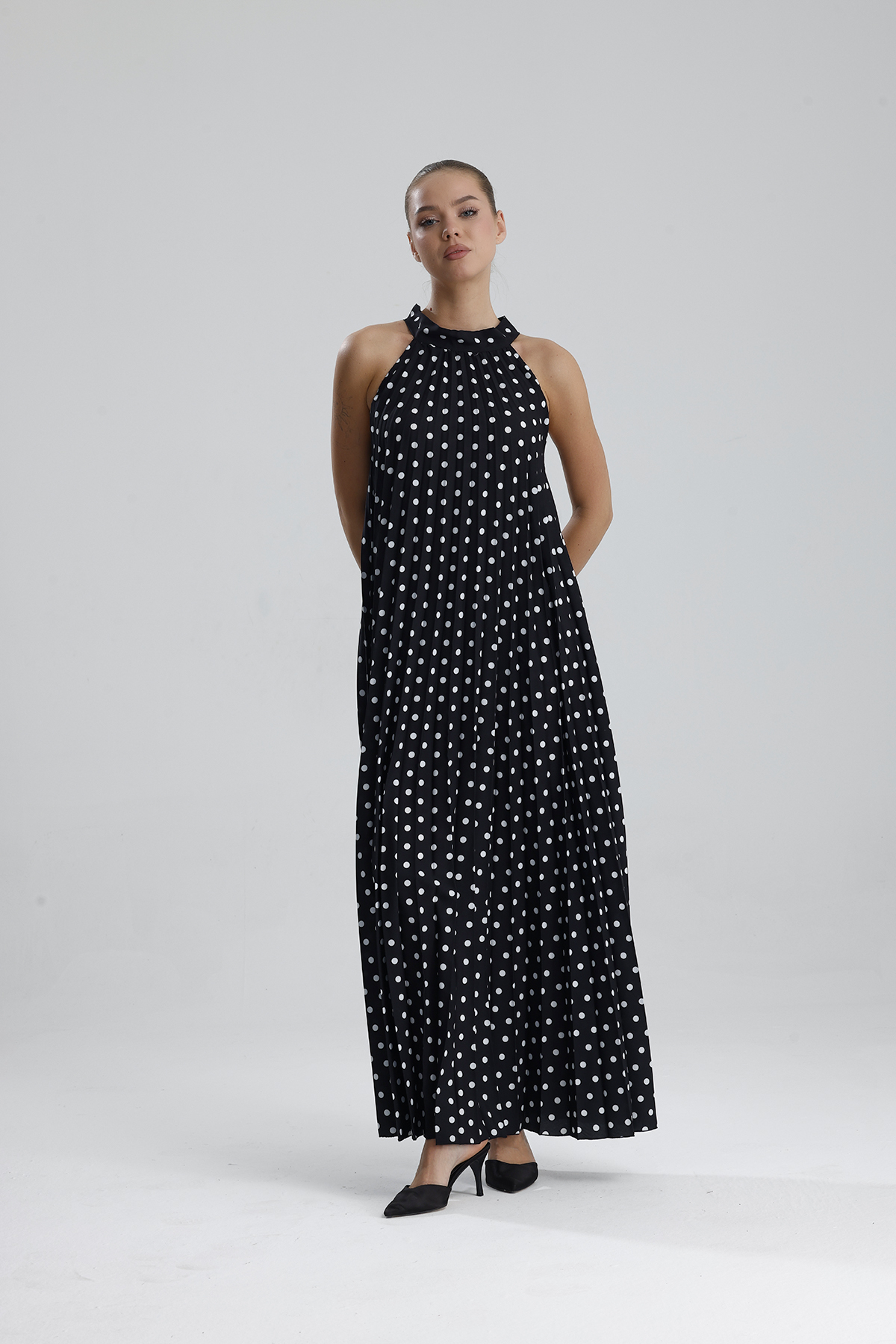 Sense Siyah Puantiyeli Boyundan Bağlamali Piliseli Kolsuz Saten Elbise | Elb34513