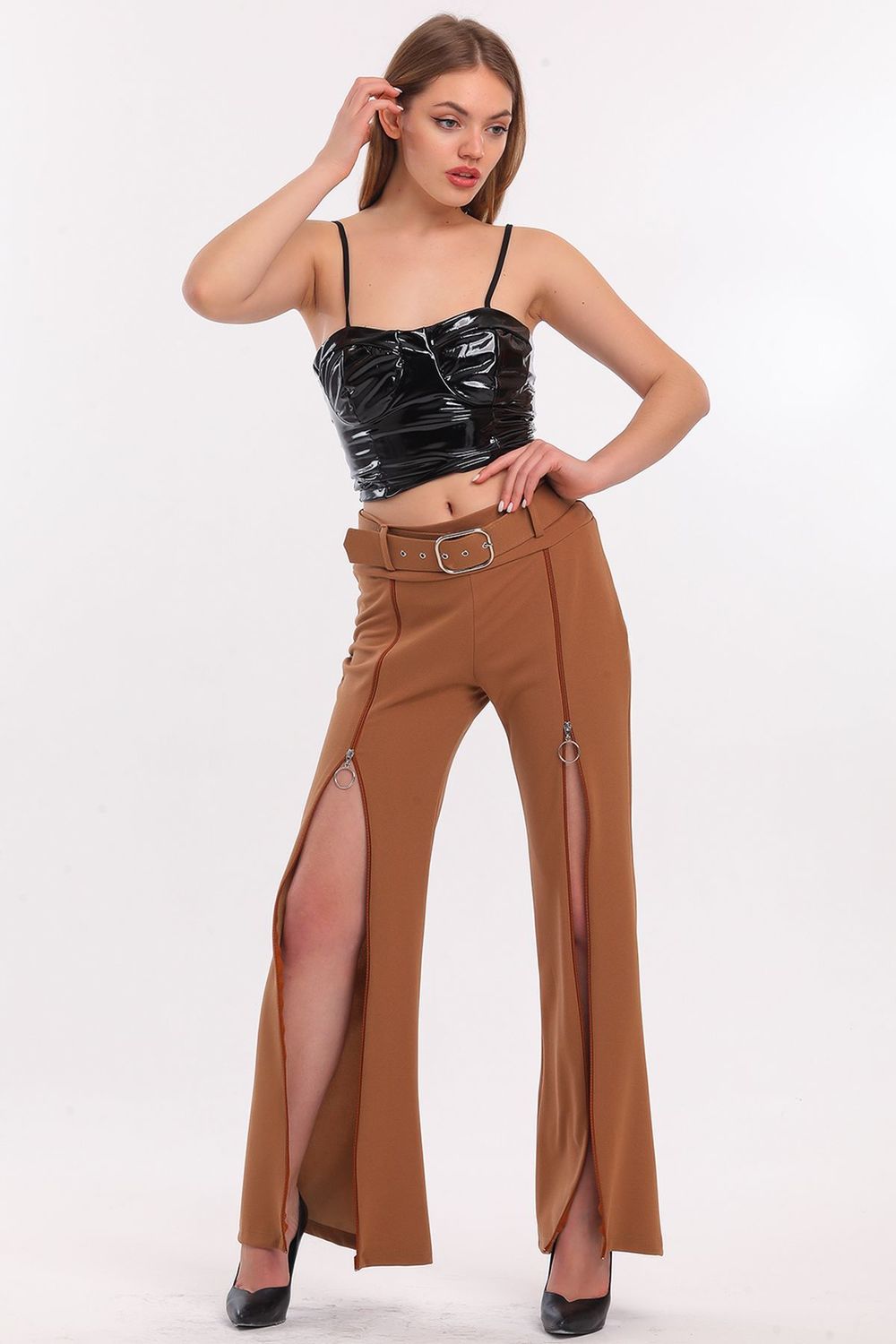 Sense Taba Kemerli Yüksek Bel Yandana Gizli Fermuarlı Deri Pantolon | PNT33134