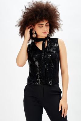 Sense Siyah Kollari Tül Buzy Payet Bluz_Blz32721