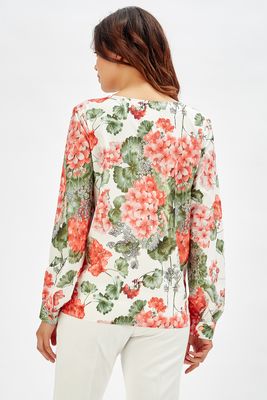 Sense Ekru Mercan Çiçekli Önü Düğmeli V Yaka Uzun Kol Beli Bağlamali Gömlek_Gml32499